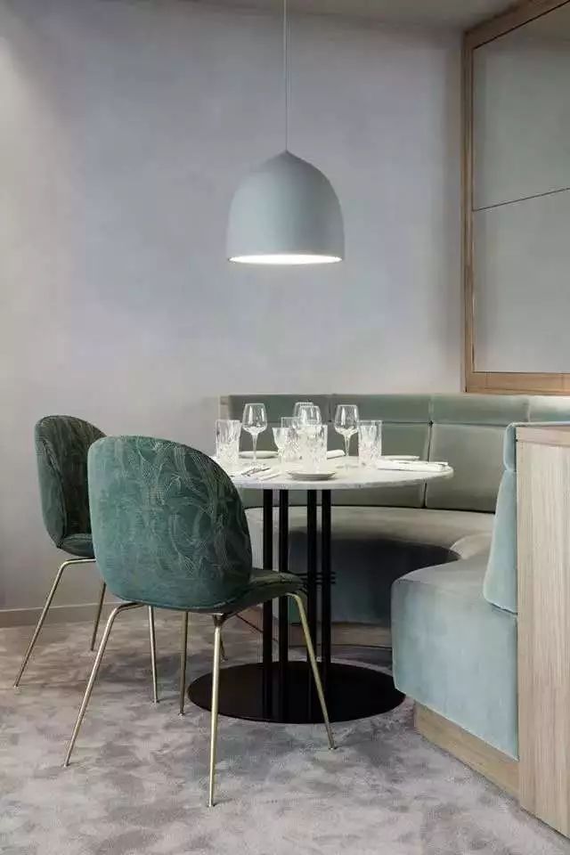 面积不大或只在一面墙设计卡座时,就可选择一字型。不仅使用方便,还能减少椅子的摆放数量,小空间首选。