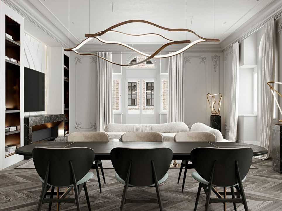 餐厅纯净的白色空间里,温润的人字拼木地板,给空间基础色带来柔和的氛围,餐桌上的吊灯如波浪般轻盈的线条清爽细腻。