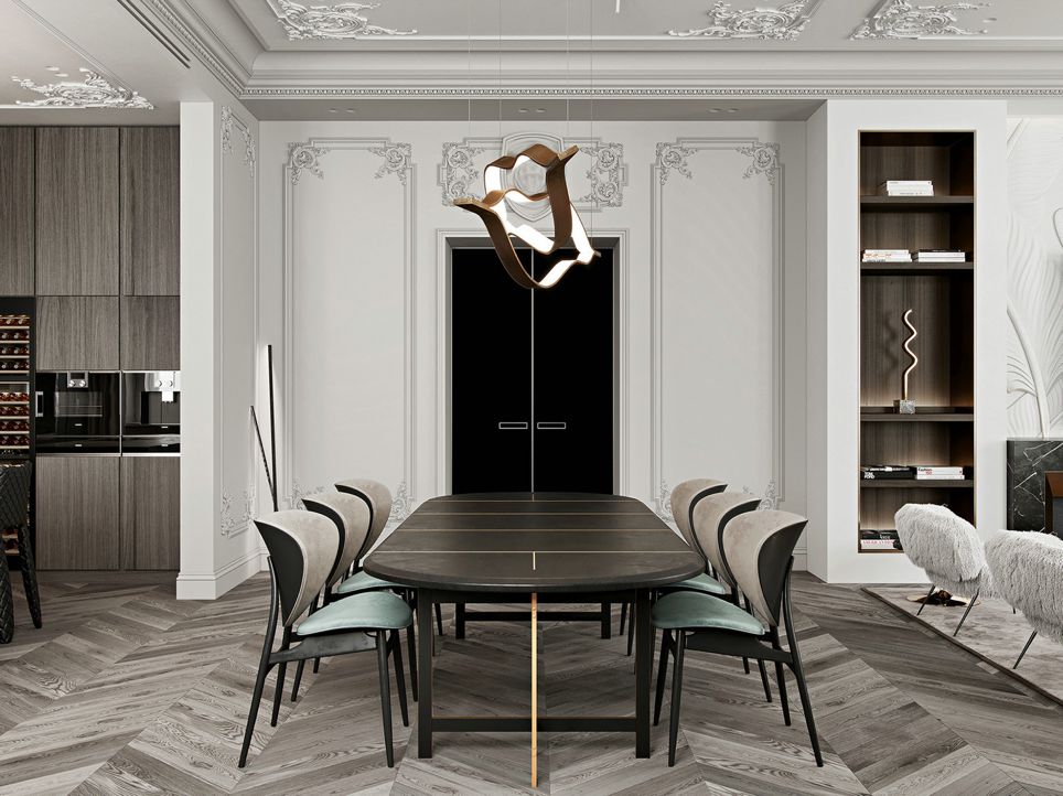 有人喜爱时尚简约,有人偏爱传统质朴,每一个不同的风格都代表着主人喜爱的生活方式。客厅家具以高级灰的极简色调,与纤细的金属装饰灯搭配,呈现一种坚柔并存的特殊味道,编织出空灵朴拙的安静感与美。大面的窗户让室内变得特别的明亮、通透,在这里,古典和现代设计和谐地结合在一起。